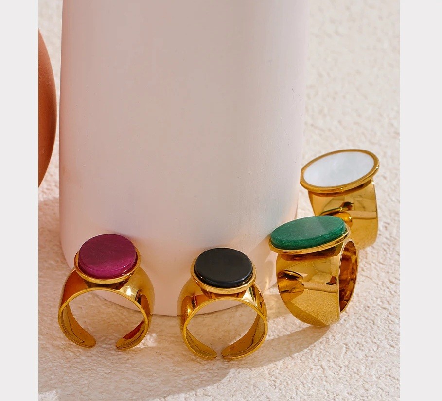 Prsten velikosti 7 s oválným výrazným kamenem 15 × 20 mm, široká obroučka, hladký minimalistický design s výraznou dominantou Tento prsten zaujme na první pohled díky výraznému oválnému kameni, který tvoří jeho dominantní prvek. Kámen má přibližný rozměr 15 × 20 mm a je usazen v jednoduchém, hladkém rámečku, který zvýrazňuje jeho tvar i povrch. Díky své velikosti působí prsten výrazně a dodává ruce elegantní, ale zároveň odvážný vzhled. Široká obroučka dodává šperku robustnější vzhled a současně poskytuje pohodlné usazení na prstu. Tvar kamene i celkové proporce působí harmonicky a vytvářejí zajímavý kontrast mezi jednoduchou linií prstenu a výrazným dekorativním středem. Tento styl je vhodný pro ty, kdo preferují jednoduchý design s výrazným prvkem.