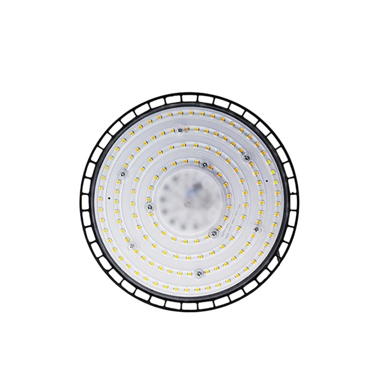 LED diody jsou rozmístěny v soustředných kruzích, což umožňuje rovnoměrné rozložení světla bez výrazných tmavých míst. Konstrukce je vhodná pro zavěšení ve výšce, kde zajistí dostatečné pokrytí osvětlením.