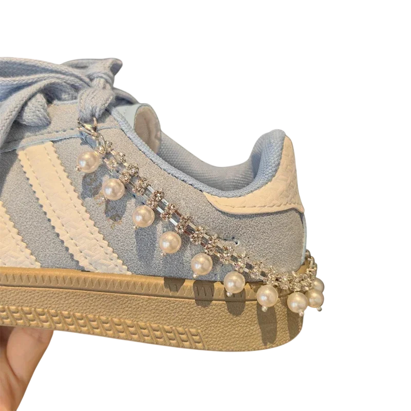 Díky jednoduchému provedení je tento doplněk vhodný pro každého, kdo hledá nenápadný, ale zajímavý detail pro svou obuv. Kombinace řetízku a perliček vytváří vyvážený vzhled, který nepůsobí rušivě a zároveň zaujme.