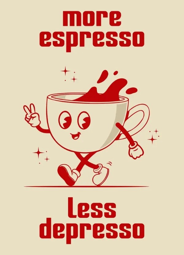 Retro plakát s vtipným motivem hrnku na nožičkách a oblíbeným nápisem „more espresso less depresso“ přináší do interiéru styl, nadhled a pozitivní energii. Originální design inspirovaný kavárenskou estetikou oživí stěnu a vytvoří příjemnou atmosféru vhodnou do kuchyně, pracovny nebo moderního pokoje. Díky většímu formátu dekorace působí výrazně a stává se přirozeným vizuálním prvkem prostoru. Barevné retro ladění dodává místnosti hravost a osobitý charakter. Kvalitní tisk na bavlněném plátně zajišťuje přirozený vzhled a dlouhou životnost motivu.