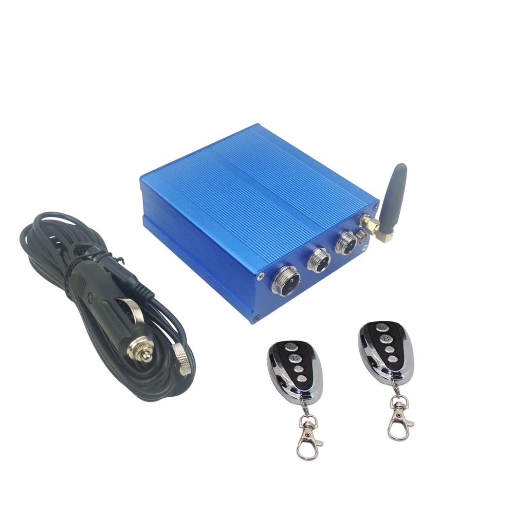 Řídicí jednotka 12V pro elektrický ventil výfuku Ovládací box s anténou Napájecí kabel do zapalovače a 2 dálkové ovladače pro ovládání výfukové klapky