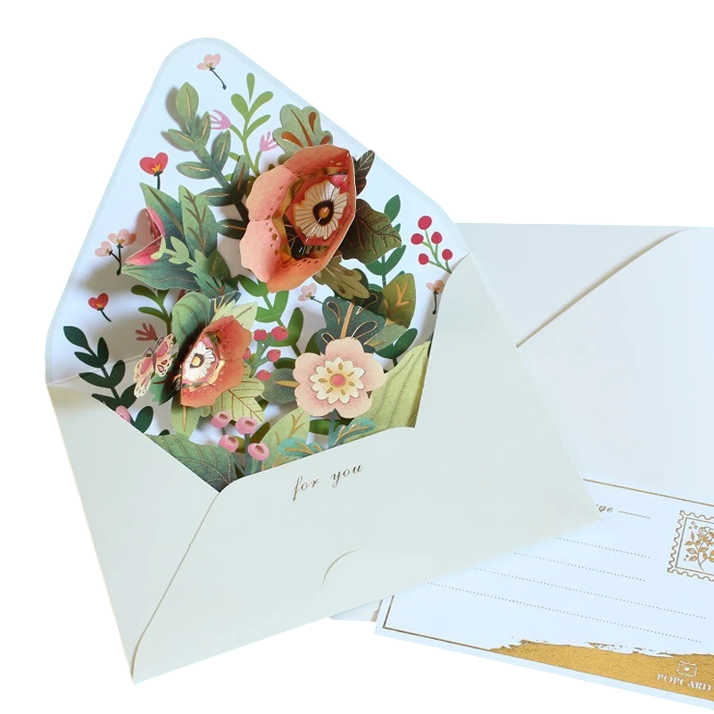 - 3D vyskakovací design s květinovým motivem – realistické barevné květy, které ožijí při otevření