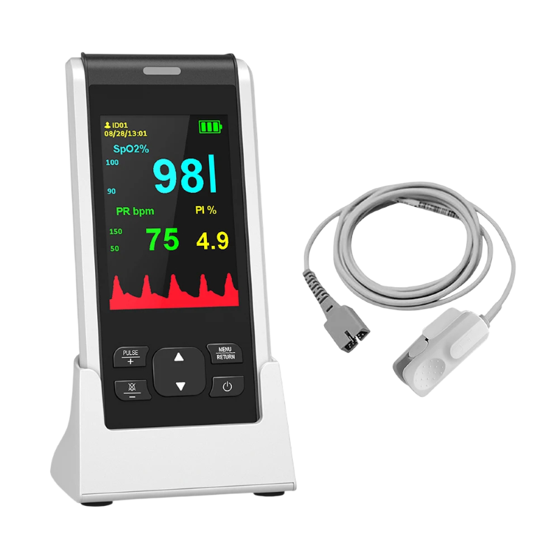 Součástí zařízení je prstová sonda, která zajišťuje přesné snímání hodnot. Ovládání probíhá pomocí tlačítek na přední straně, což umožňuje snadné přepínání funkcí a kontrolu měření. Přenosné provedení a dobíjecí řešení zajišťují flexibilní použití v různých situacích.