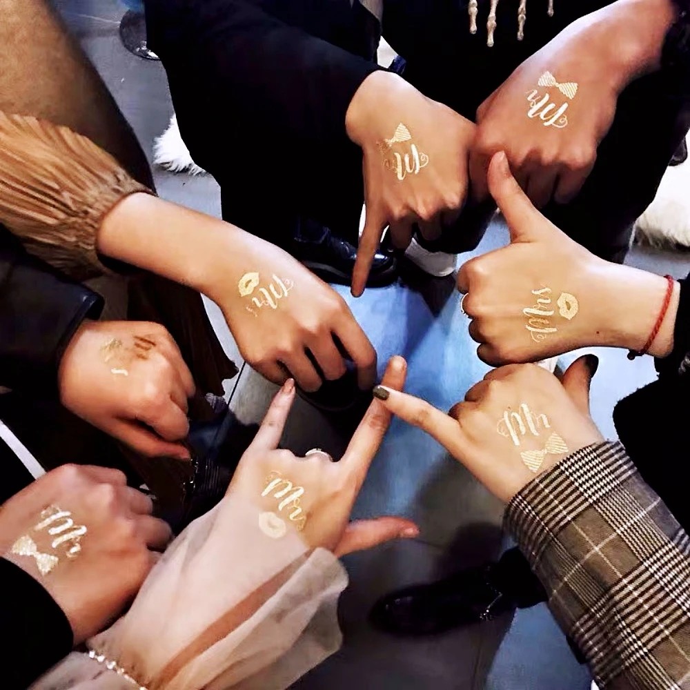 Tato sada 10 dočasných tetování s motivy Bride Tribe je originálním doplňkem na rozlučku se svobodou nebo dámskou oslavu. Tetování obsahují různé zlaté nápisy a symboly jako „Bride Tribe“ (Nevěstin tým), „Team Bride“ (Tým nevěsty), „Bride To Be“ (Budoucí nevěsta) a další svatební motivy. Metalický zlatý efekt působí slavnostně a krásně vynikne na fotografiích. Motivy jsou zasílány v náhodném výběru.