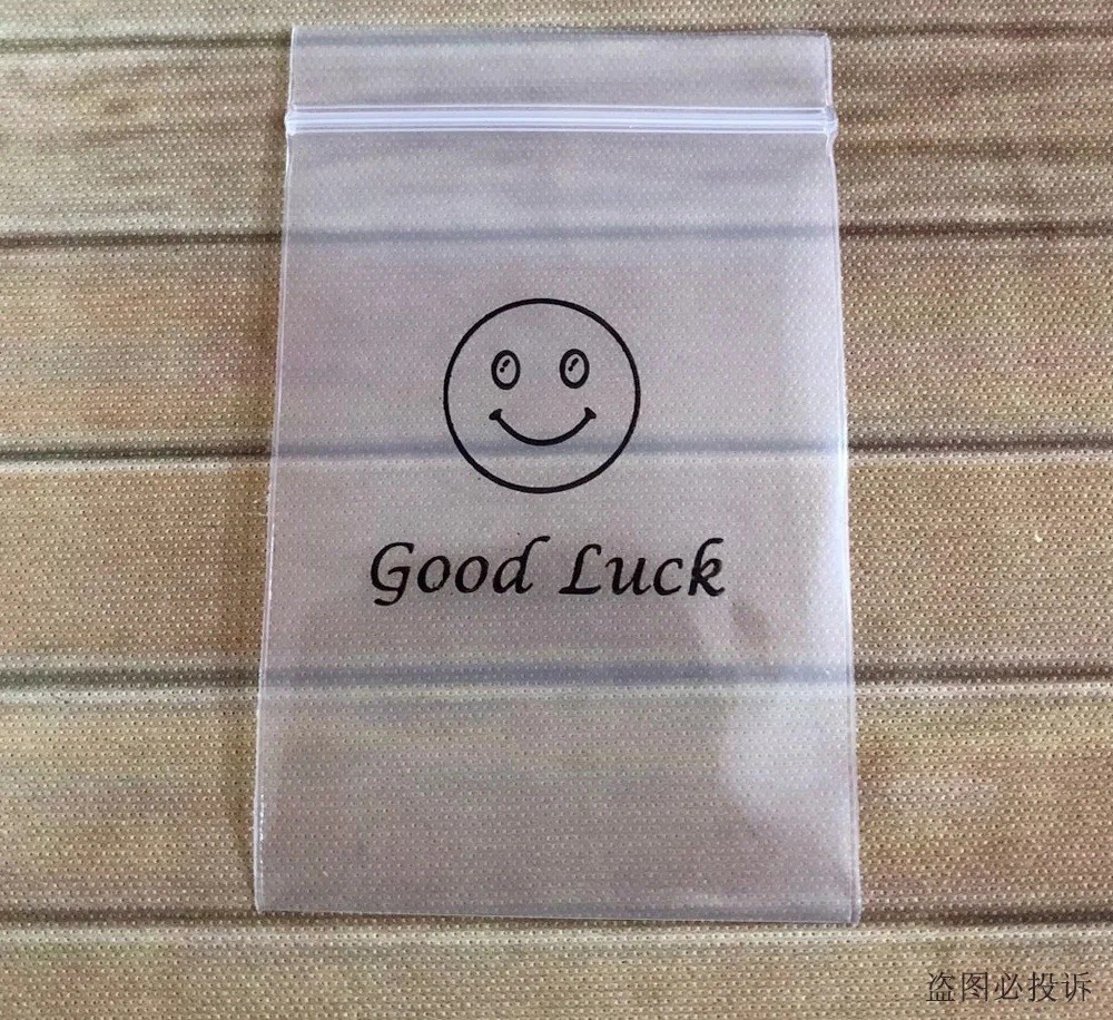 Na přední straně je potisk s jednoduchým motivem – usměvavý smajlík doplněný textem „Good Luck“ (Hodně štěstí). Tento detail dodává balení osobnější a přátelštější charakter, což oceníte například při předávání drobných dárků nebo pozorností.