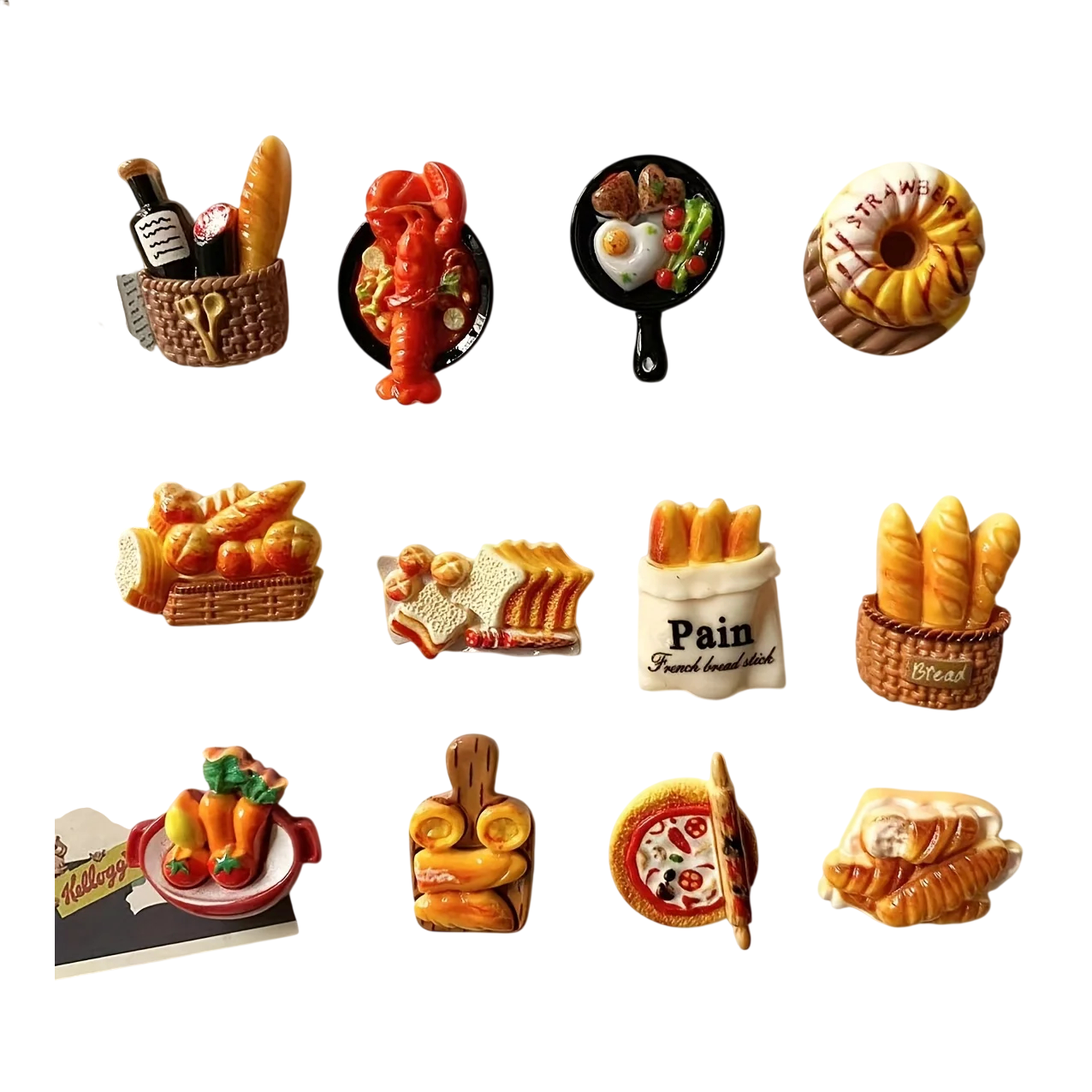 Sada 12 ks magnetky 3D 2–3,5 cm pryskyřice motiv jídla dekorativní magnety na lednici a kovové plochy do kuchyně