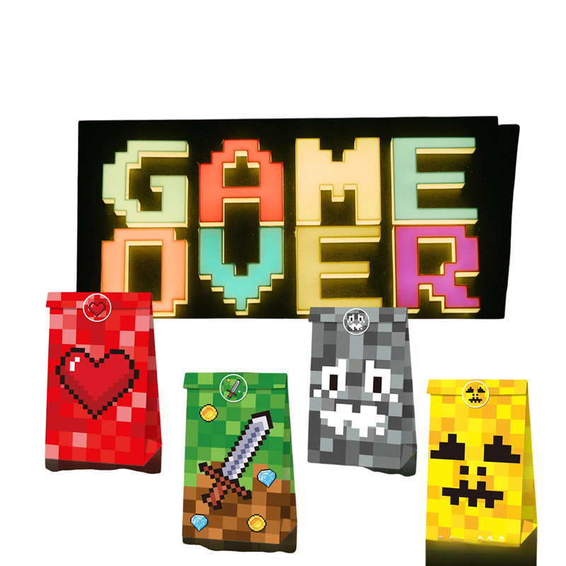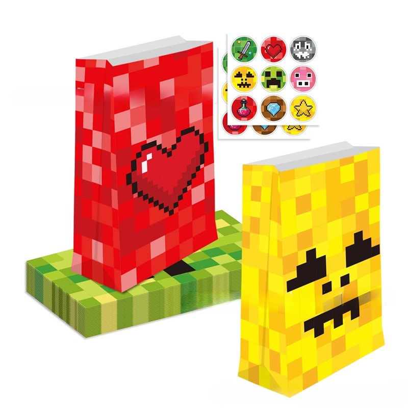 Sada 12 papírových sáčků 22 x 12 x 8 cm a 18 samolepek 3,8 cm s herním motivem Minecraft Kraftové dárkové tašky Gaming párty dekorace
