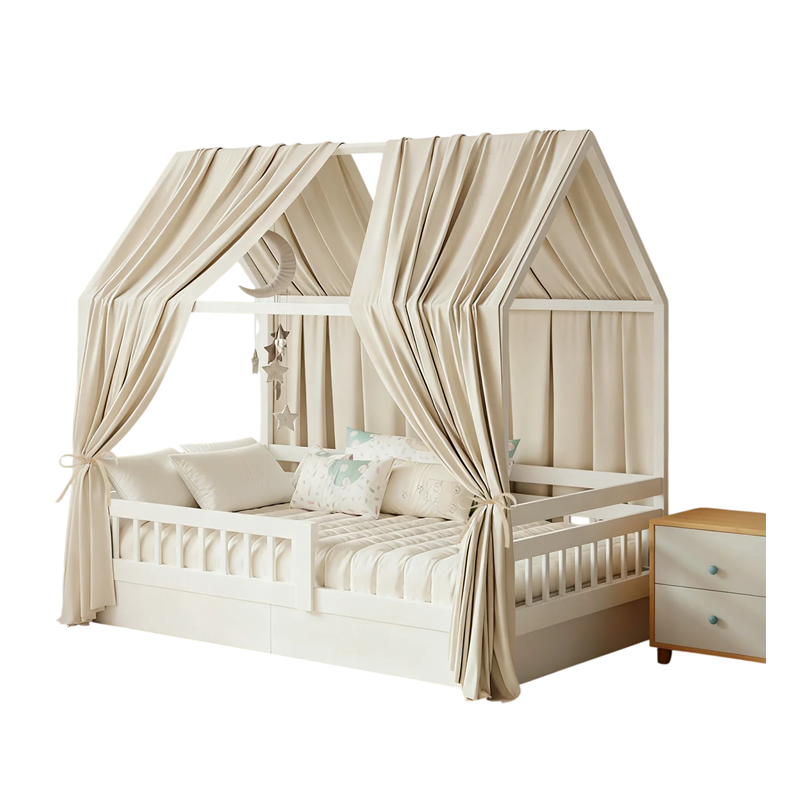 Sada baldachýnů nad postel je praktickým textilním doplňkem, který pomáhá vytvořit útulné a klidné prostředí v dětském pokoji. Díky jednoduchému provedení se baldachýny snadno umisťují na konstrukci postele a lze je přizpůsobit podle konkrétního uspořádání. V prostoru nad lůžkem vytvářejí jemné zastínění, které působí přirozeně a nenarušuje okolní interiér.