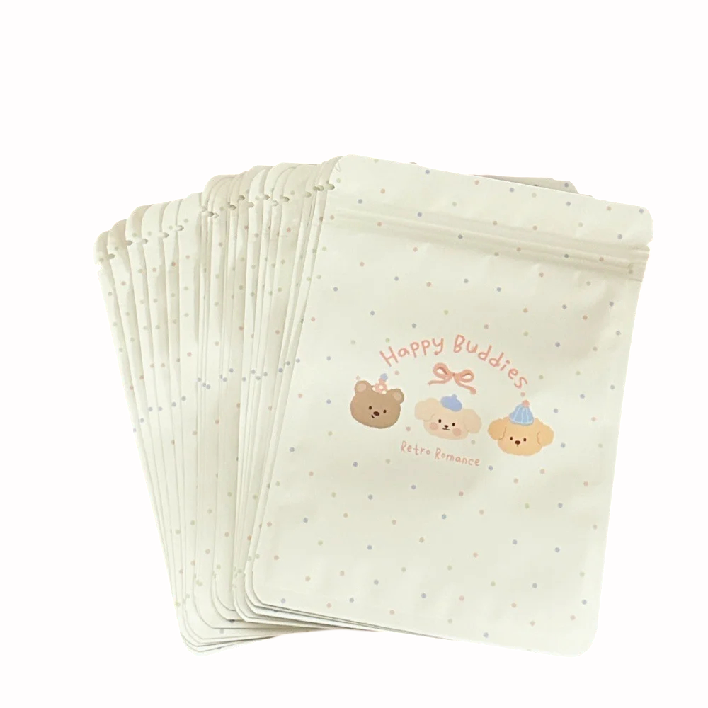 Sáčky mají světlý podklad s jemným celoplošným vzorem malých barevných teček. Na přední straně se nachází dekorativní potisk s motivem kreslených zvířátek a nápisem „Happy Buddies“. Design působí hravě a je doplněn drobnými grafickými prvky, které zvýrazňují dárkový charakter sáčků.