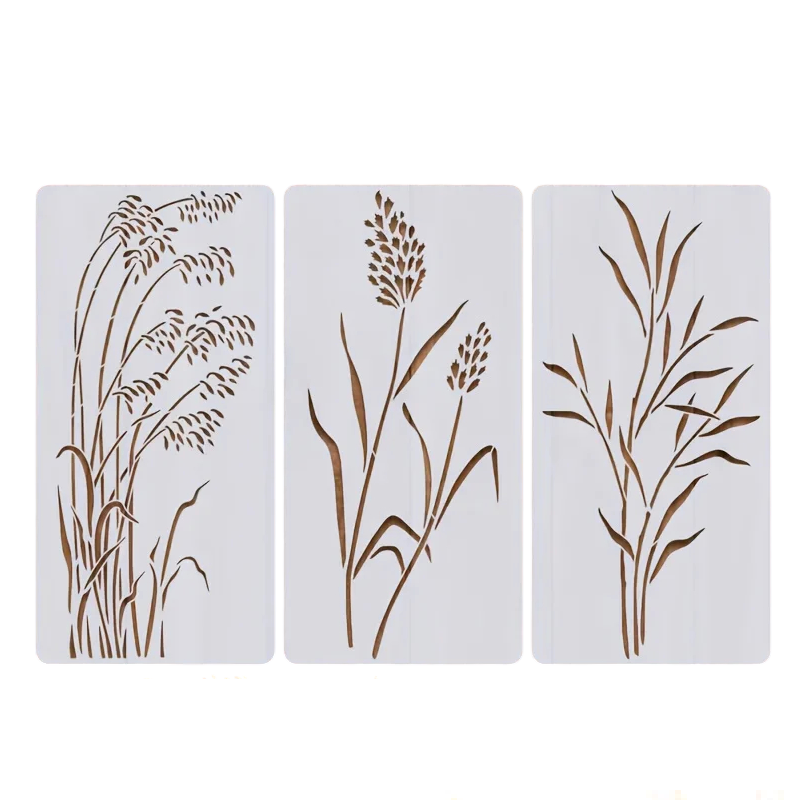 Sada velkých šablon s motivy rostlin je vhodná pro tvorbu dekorací na různé povrchy v interiéru i exteriéru. Rostlinné vzory přinášejí přirozený vzhled a umožňují vytvořit zajímavé kompozice bez nutnosti složitého kreslení. Každá šablona obsahuje jiný motiv inspirovaný travinami a přírodními prvky. Díky tomu lze jednotlivé vzory kombinovat nebo použít samostatně podle typu projektu a požadovaného výsledku.