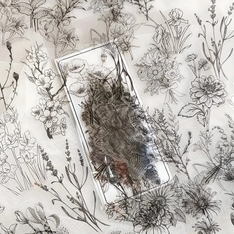 Sada 40 ks černobílých samolepek s květinovými a rostlinnými motivy na průhledné plastové nálepce, ideální pro dekorace, přání a personalizaci různých předmětů. Celý popis