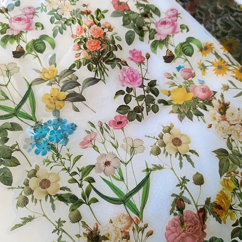 Tato sada samolepek obsahuje krásné květinové motivy, které se perfektně hodí pro všechny kreativní projekty. Sada obsahuje různé květiny, jako jsou růže, pivoňky, slunečnice, orchideje, fialky, narcisy a mnoho dalších. Každá samolepka je vytištěna na průhledné plastové nálepce, což znamená, že se skvěle hodí k dekoracím na různých pozadích. Díky jemné barevnosti a realistickým detailům přináší do vašich projektů přírodní nádech a eleganci.