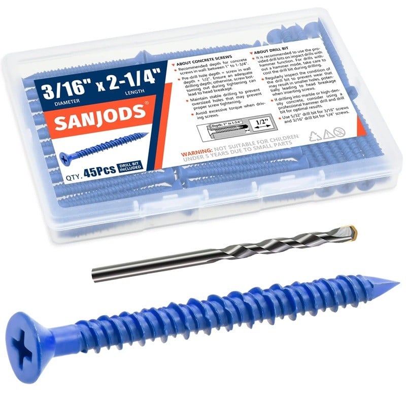 Sada 45 ks šroubů do betonu 3/16" x 5,7 cm nerezová ocel modré ploché vruty do zdiva cihel cementu s vrtákem