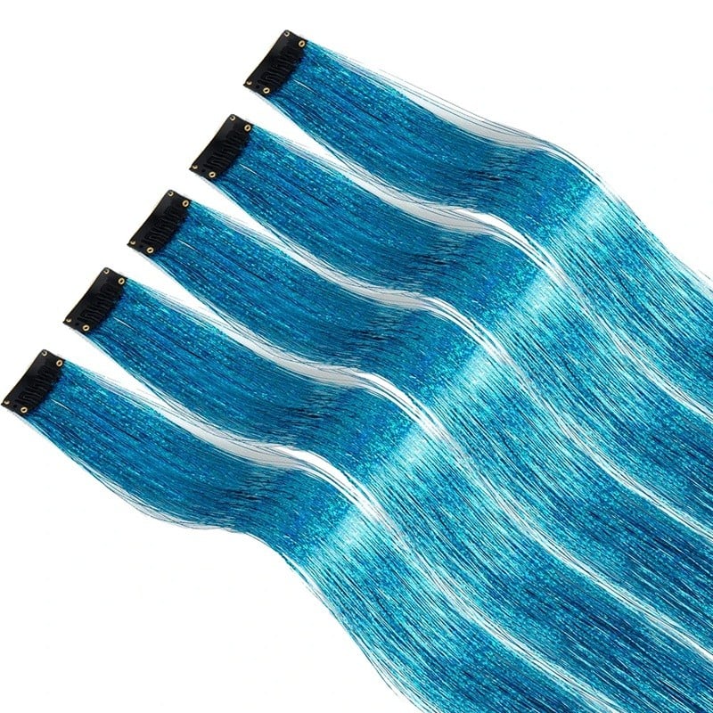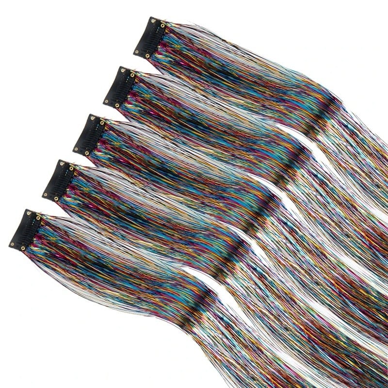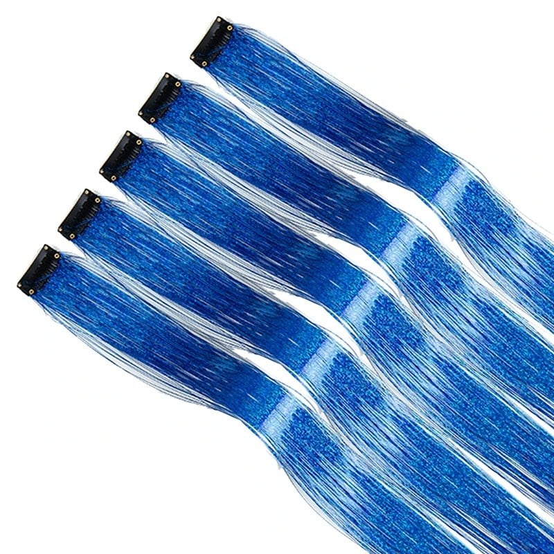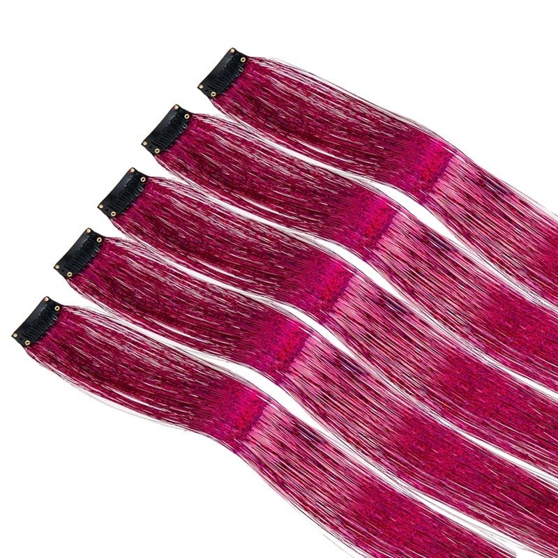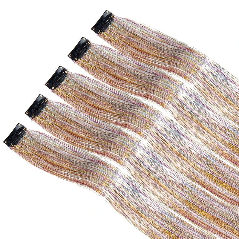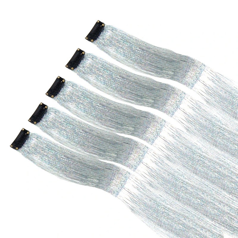 Sada 5 ks třpytivé pramínky do vlasů lamety 50 cm syntetické prodloužení vlasů klipové uchycení pro styling účesu