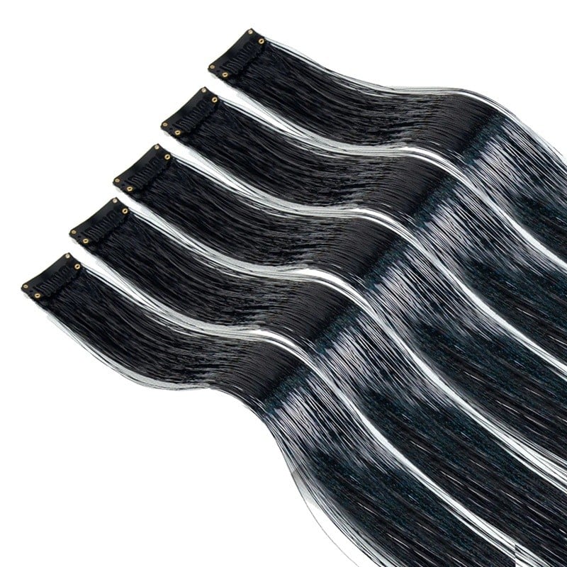 Na obrázku je vidět, že pramínky mají jemnou strukturu a vysoký lesk, který odráží světlo a vytváří výrazný vizuální efekt. Materiál působí lehce a přirozeně splývá s vlasy. Konstrukce klipu zajišťuje pevné uchycení a snadnou manipulaci.