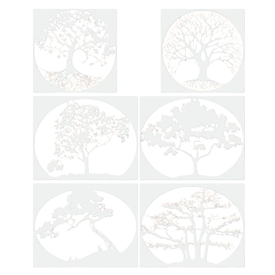Sada plastových šablon s motivy stromů je určena pro dekorativní malování a kreativní tvorbu. Jednotlivé šablony zobrazují různé stylizované stromy v kruhovém i částečně ohraničeném provedení, což umožňuje vytvářet zajímavé kompozice na různých površích.
