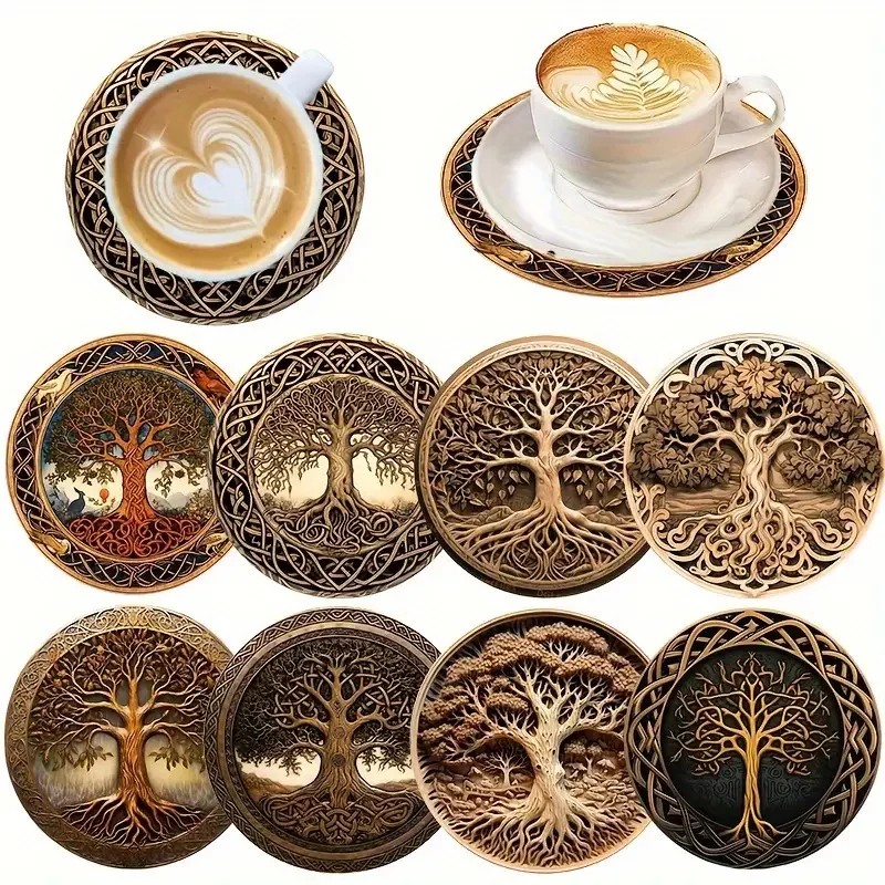 Dřevěné podtácky sada 8 ks malovaný motiv stromu protiskluzové prostírání na sklenice a hrnky barevné dřevěné tácky na nápoje