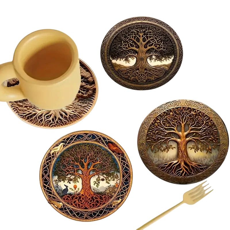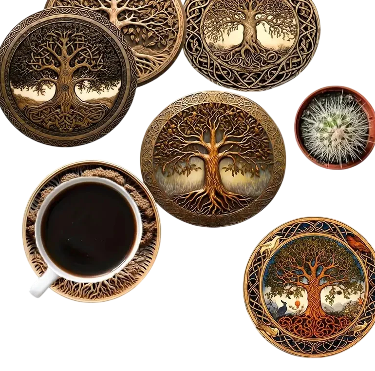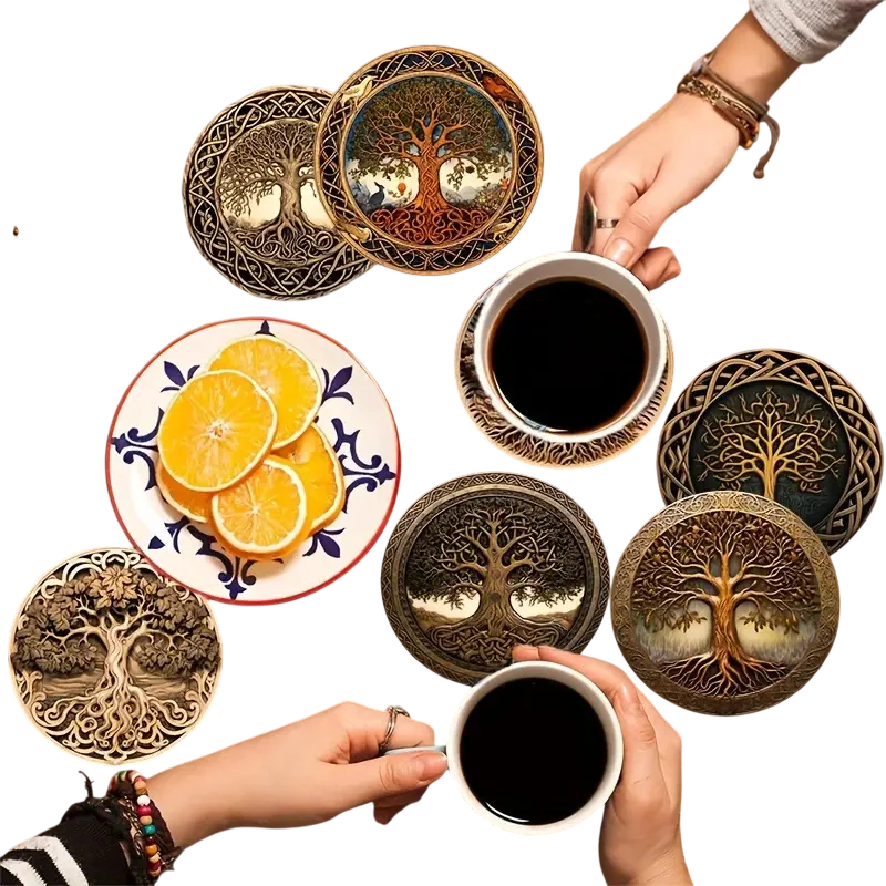 Sada dřevěných podtácků může být praktickým doplňkem pro každodenní stolování i servírování nápojů. Kombinace dřevěného materiálu a dekorativního motivu stromu vytváří zajímavý prvek na jídelním nebo konferenčním stole. Díky většímu počtu kusů lze podtácky využít při běžném stolování nebo při servírování nápojů pro hosty.