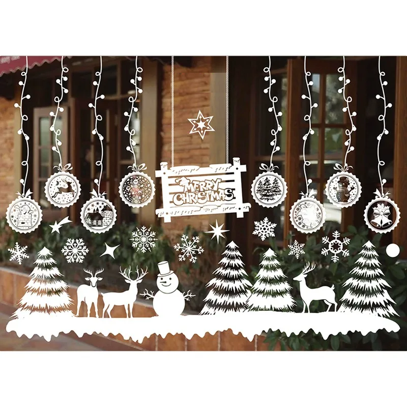 Sada bílých vánočních samolepek na okno 55 x 75 cm PVC ozdoby s vločkami sněhulákem a jeleny Zasněžené dekorace pro zimní výzdobu