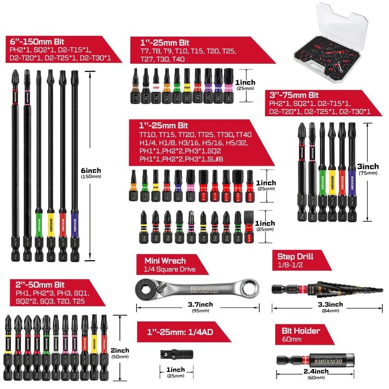 Sada bitů Geinxurn 58 ks pro rázový šroubovák s držákem bitů adaptérem a stupňovitou vrtačkou vícebitová sada pro kutily