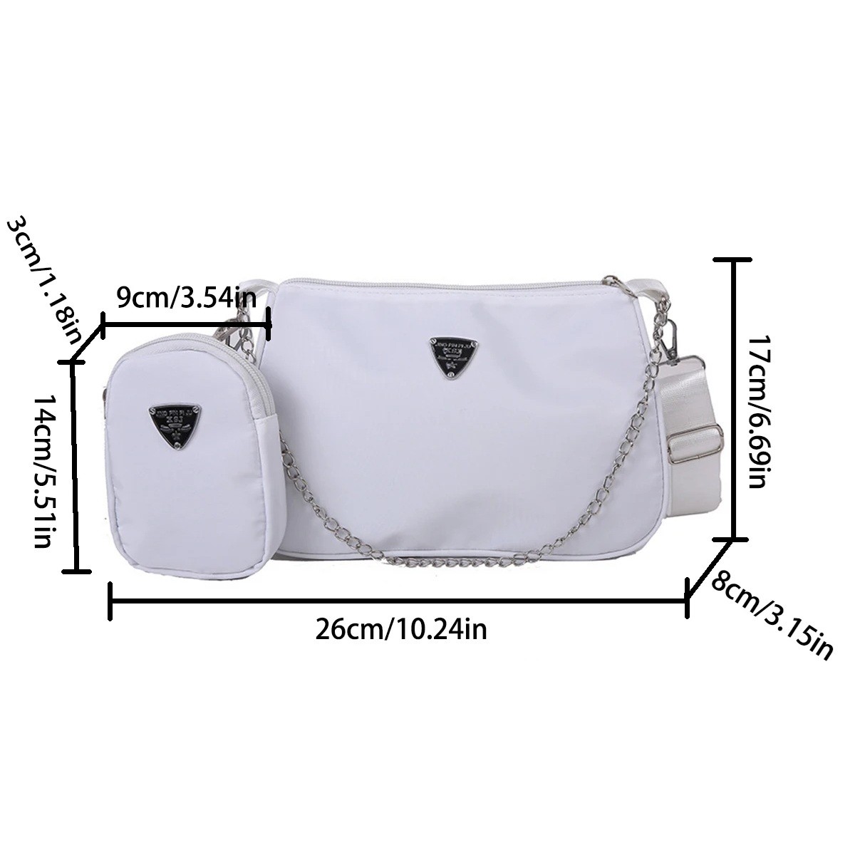 Tato sada dámské kabelky a pouzdra je navržena s důrazem na praktičnost a pohodlí při každodenním používání. Hlavní kabelka o rozměrech 26 x 8 x 17 cm poskytuje dostatek prostoru pro osobní věci, zatímco menší pouzdro slouží k přehlednému uložení drobností. Díky provedení z nylonu je sada lehká a vhodná pro časté nošení. Jednoduchý a čistý vzhled se snadno kombinuje s různými outfity. Celek působí nenápadně, ale zároveň funkčně.