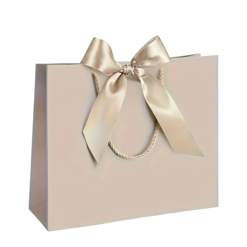 Tato velikost nabízí nejvíce prostoru pro dárkové balení z uvedených variant. Vzhled tašky je postavený na jednoduchém barevném provedení a výrazné mašli. Díky pevnému tvaru a uchům je taška praktická pro přenášení i předání dárku. Béžový odstín působí neutrálně a snadno se kombinuje. Sada více kusů je vhodná pro opakované použití.