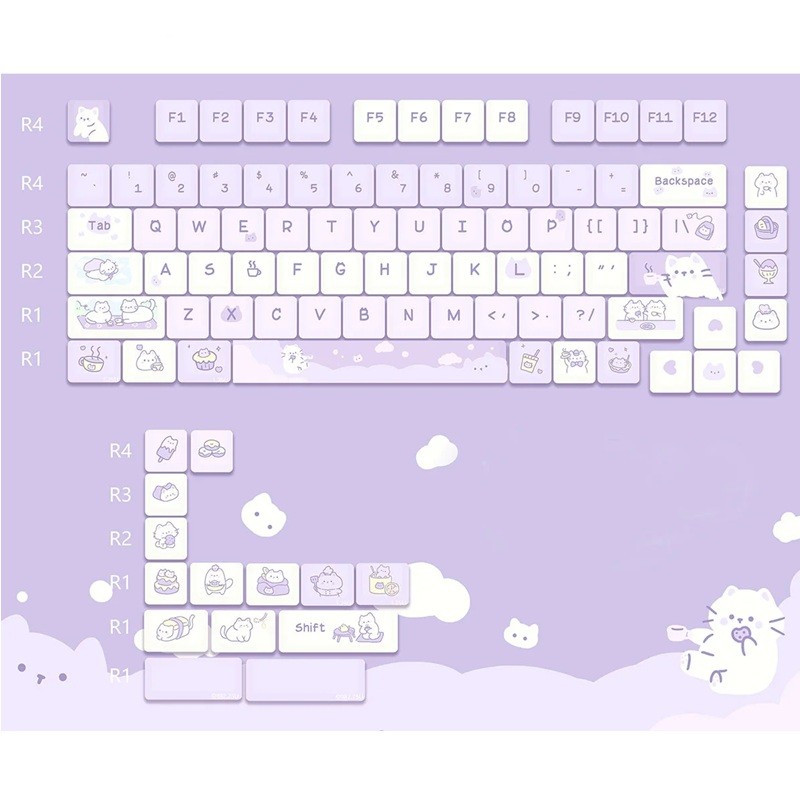 Úvodní strana Úvodní strana Příslušenství pro PC a notebooky Příslušenství pro počítač Klávesnice Mechanické klávesnice Sada krytek na klávesy cartoon motiv 95 ks PBT MOA profil fialová bílá keycaps pro mechanickou klávesnici herní i kancelářskou