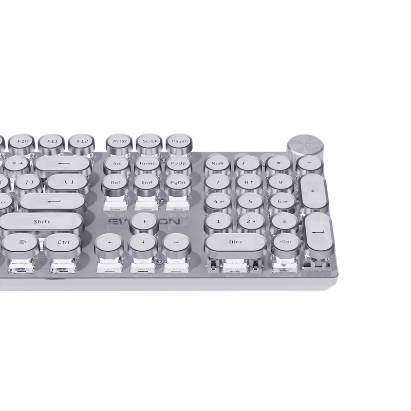 Retro design v kombinaci s moderním podsvícením vytváří zajímavý kontrast mezi klasikou a současným stylem. Kulatý tvar kláves je na první pohled odlišný od běžných hranatých sad a může být výrazným doplňkem pracovního stolu. Díky plnému rozložení se sadou 104 kusů zůstává zachována funkčnost numerické části i všech běžných kláves. Model je určen přímo pro EWEADN V20, což usnadňuje výměnu původních kláves. Bílé světlo působí čistě a nerušivě při každodenním používání.