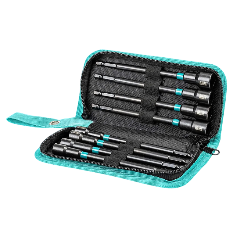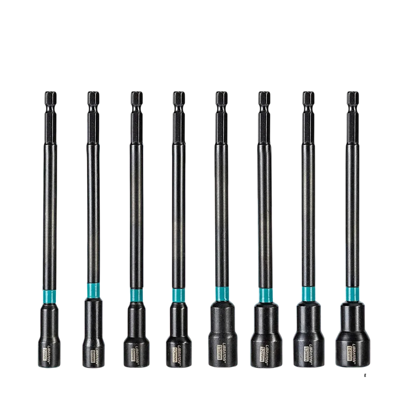 Každý bit má délku 150 mm, což usnadňuje práci v hlubších otvorech nebo úzkých prostorech. Sada obsahuje 8 kusů nástrčných bitů, které pokrývají různé velikosti podle zobrazení. Díky magnetickému provedení drží šrouby lépe na bitu a manipulace je přesnější. Nástavce jsou vybaveny šestihrannou stopkou, která je kompatibilní s běžnými vrtačkami a rázovými nástroji. Konstrukce je přizpůsobena pro efektivní přenos síly při utahování.