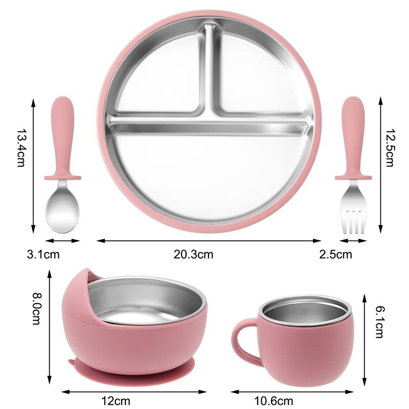 Sada nerezového nádobí pro děti s odnímatelnou silikonovou miskou a děleným talířem 20,3 cm nerez silikon krmení dětí