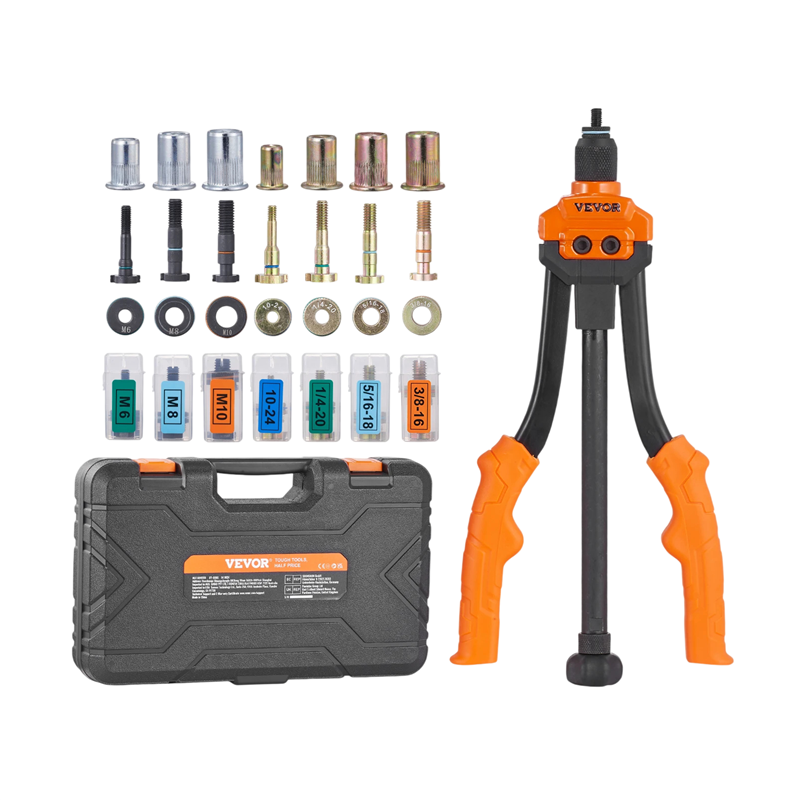 Sada nýtovacích matic s pákovým lisem 40 cm 70 ks ocel černo oranžová s výměnnými trny pro montáž závitových nýtů