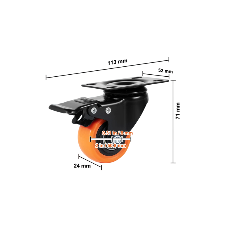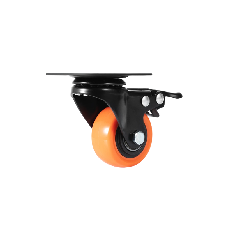 Konstrukce kolečka je navržena tak, aby byla vhodná pro širokou škálu použití. Oranžové kolečko je usazeno v černém držáku a zajišťuje plynulý pohyb při posunu. Díky otočnému mechanismu lze kolečka použít tam, kde je potřeba snadná manipulace a změna směru. Tato sada je vhodná pro situace, kdy je potřeba mobilita i možnost pevného zajištění díky integrované brzdě.