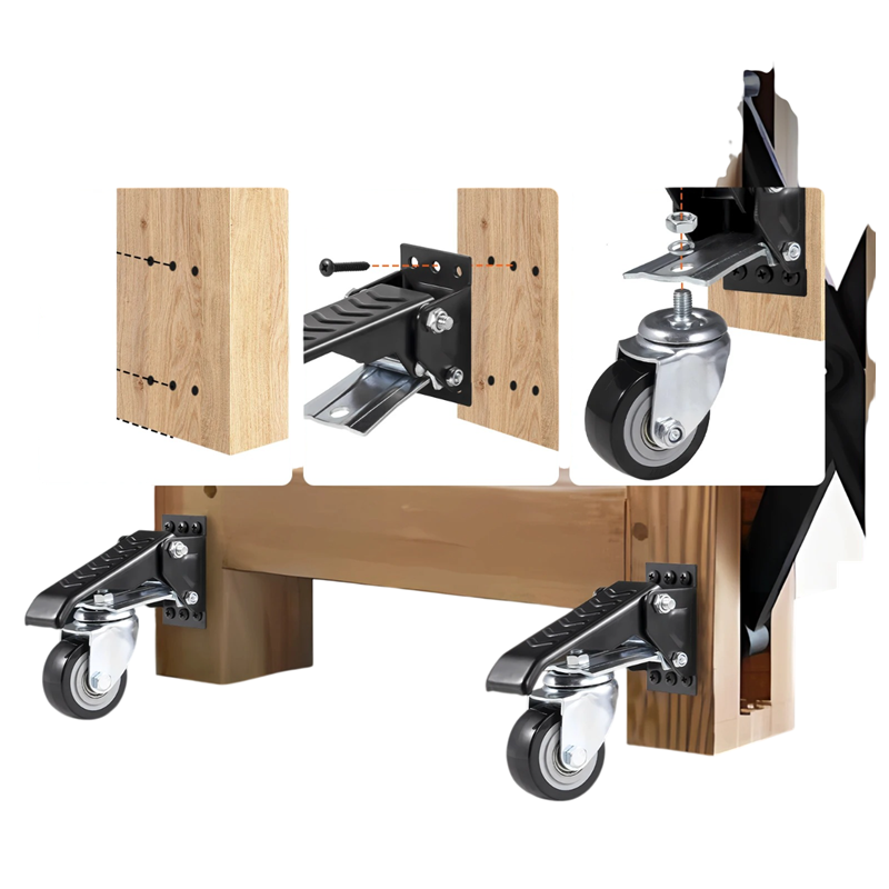 Sada 4 otočných koleček s brzdou, rozměry 160×70×174 mm. Součástí balení jsou šrouby a pracovní rukavice pro jednoduchou montáž. Celý popis