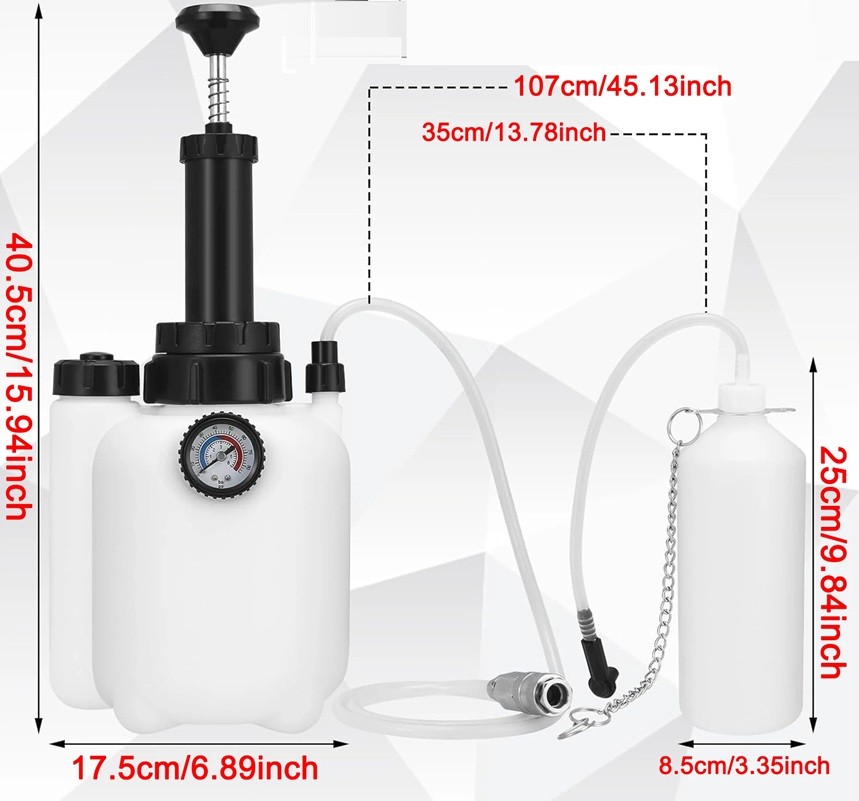Součástí sady je také samostatná menší nádoba, která slouží k zachycení kapaliny během odvzdušňování. Konstrukce je doplněna o potřebné spojovací prvky a těsnění. Rozměry hlavní nádoby jsou přibližně 40,5 × 17,5 cm, délka hadice je cca 107 cm a menší nádoba má výšku přibližně 25 cm.