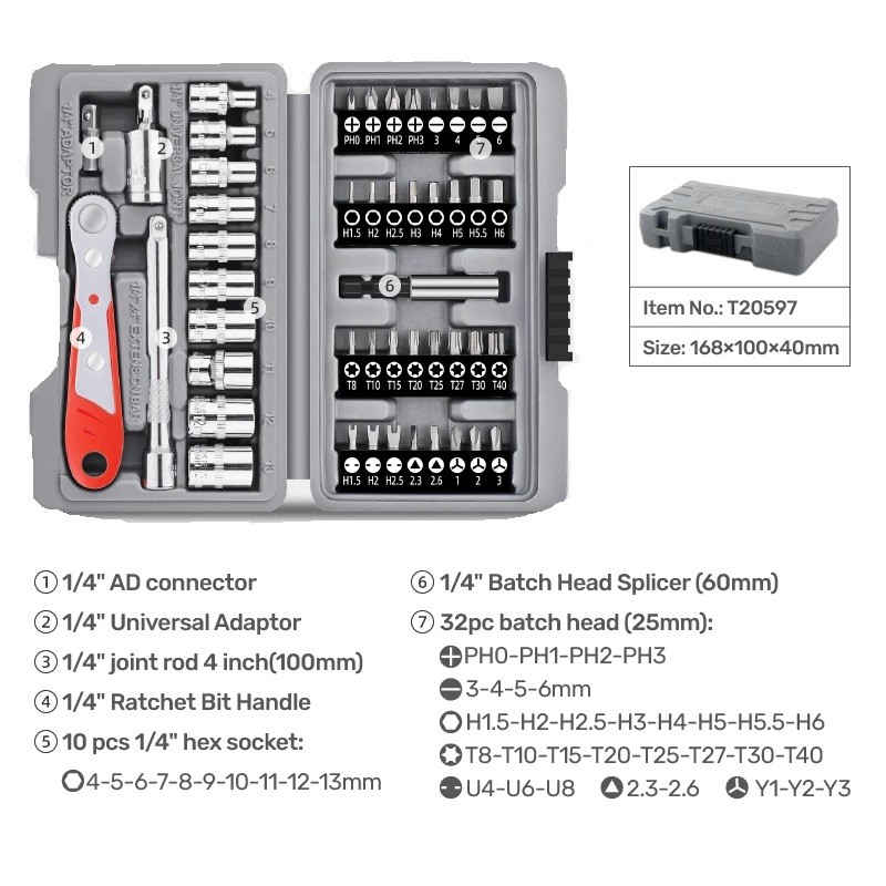 Konstrukce z chrom-vanadové oceli zajišťuje odolnost při každodenním používání. Ergonomická rukojeť ráčny nabízí jistý úchop při práci. Díky standardní velikosti 1/4" je sada kompatibilní s běžným příslušenstvím. Součástí jsou různé typy bitů, včetně křížových, plochých a dalších variant podle označení. Celkem 47 kusů poskytuje dostatečnou variabilitu pro různé úkoly.