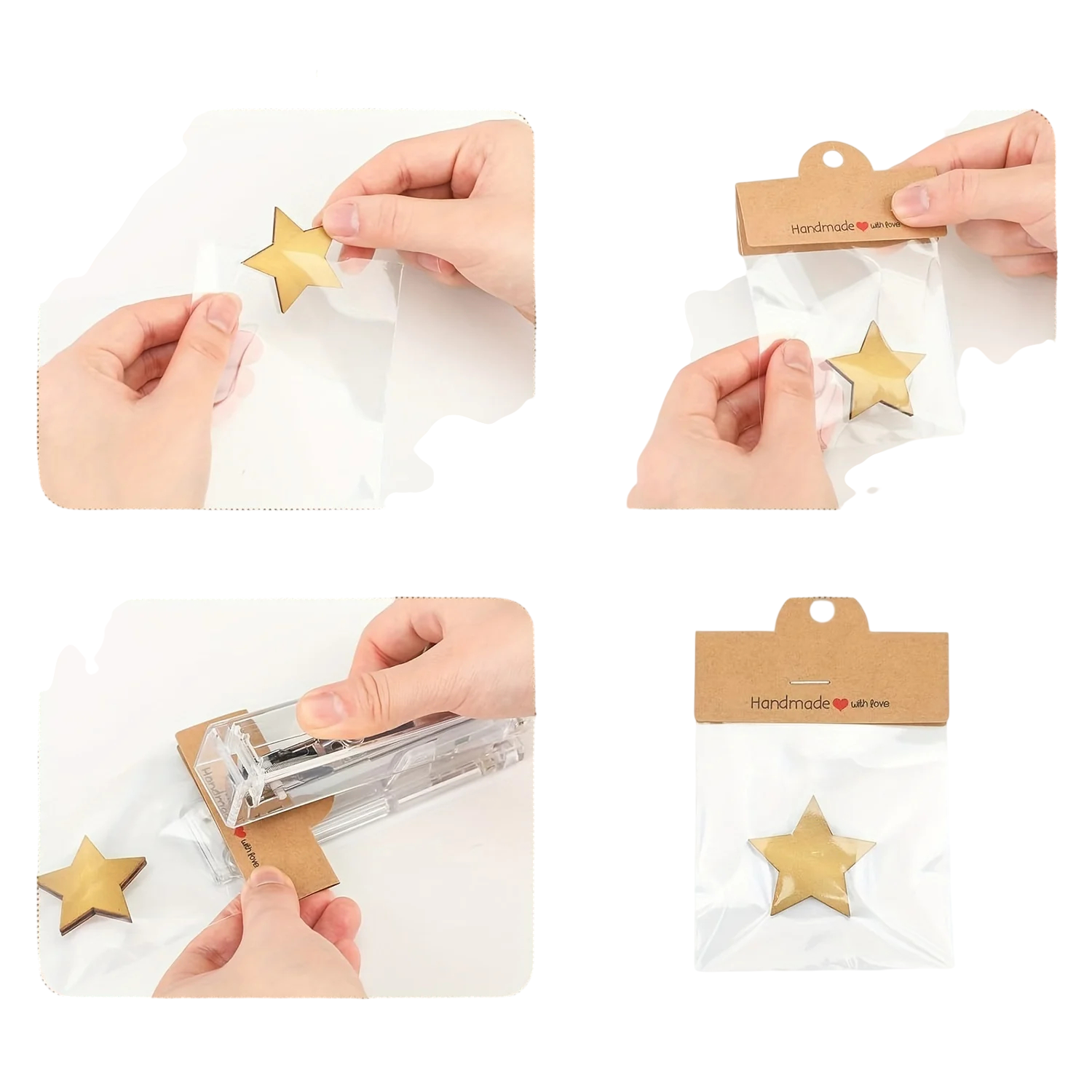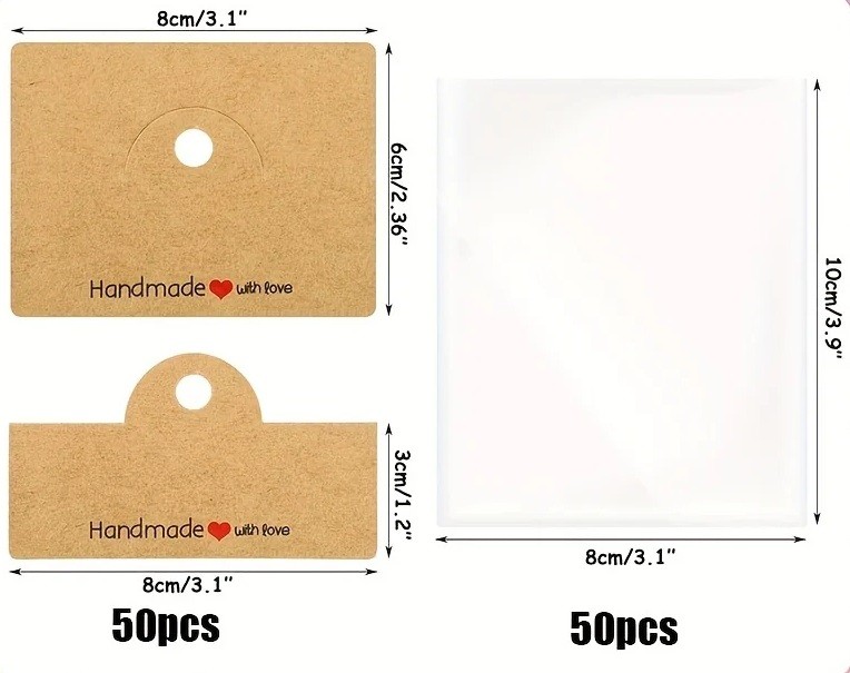 Sada sáčků na mini dárky a šperky s kartičkou „Handmade with love“, průhledné dárkové sáčky s papírovým štítkem Tato sada dárkových sáčků je určena pro elegantní, přehledné a praktické balení drobných předmětů. Díky průhlednému provedení sáčku je obsah dobře viditelný a zároveň chráněný před prachem a drobnými nečistotami. Každý sáček je doplněn o pevnou papírovou kartičku s nápisem
