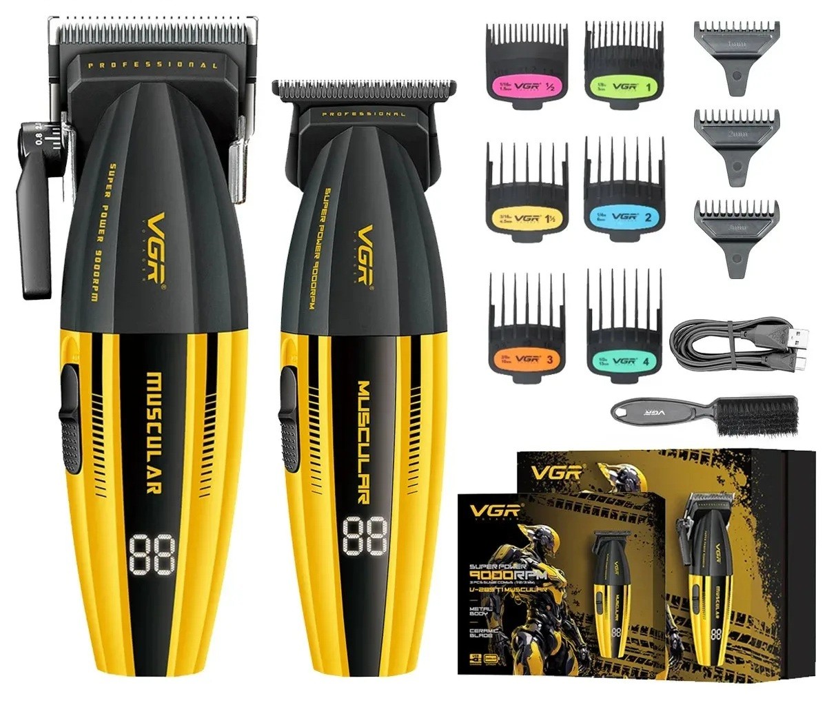 Sada zastřihovačů VGR obsahuje hlavní strojek na vlasy a menší konturovací strojek pro detailní úpravy. Hlavní přístroj je vybaven akumulátorem 2000 mAh a podle vyobrazení nabízí provoz až 240 minut. Praktické USB nabíjení umožňuje snadné dobíjení doma i na cestách. Na těle strojku se nachází LCD displej pro přehled o stavu zařízení. Přesný střih podporuje keramická čepel a více nástavců pro různé délky.