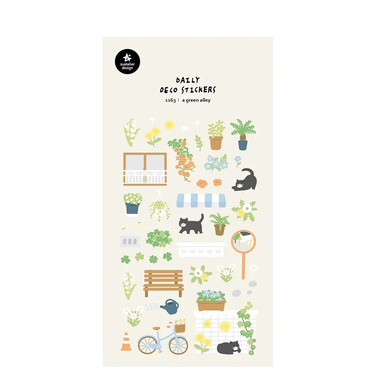 Samolepky s botanickým motivem přinášejí jemné ilustrace květin, listů, květináčů a dalších přírodních detailů. Na archu jsou viditelné rostliny, lavička, konev, jízdní kolo i drobné zahradní prvky, které vytvářejí klidnou atmosféru zeleného zákoutí. Díky rozměru 9,2x15 cm je arch praktický pro uložení do diáře, penálu nebo kreativní složky. Materiál PVC je vhodný pro běžné dekorativní použití a snadnou manipulaci. Kombinace zelenožlutých tónů působí svěže a příjemně.
