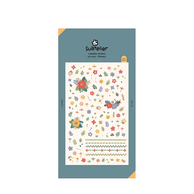 Dekorativní arch samolepek je inspirovaný květinami, drobnými lístky a jemnými přírodními detaily. Na archu jsou viditelné ilustrace barevných květů, větviček, listů a ozdobných linií vhodných pro dekorování stránek i drobných předmětů. Praktický rozměr 9,2x15 cm umožňuje pohodlné uložení do diáře, penálu nebo zásuvky s kreativními potřebami. Samolepky jsou vyrobeny z PVC materiálu, který je vhodný pro běžné dekorování hladkých povrchů. Výrazný modrý podklad doplňuje pestré květinové motivy a vytváří elegantní vzhled archu.
