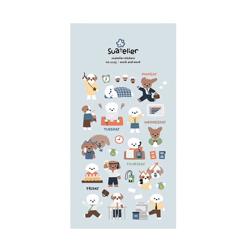 Dekorativní arch samolepek zachycuje pracovní týden pomocí veselých ilustrací pejsků a každodenních činností. Na archu jsou viditelné motivy práce, kancelářských úkolů, kávy, plánování i jednotlivých dnů týdne. Praktický rozměr 9,2x15 cm umožňuje snadné uložení do diáře, penálu nebo zásuvky s kreativními potřebami. Samolepky jsou vyrobeny z matného papíru, který působí jemně a dobře ladí s psanými poznámkami. Světlý modrý podklad doplňuje barevné ilustrace a přispívá k přehlednému vzhledu archu.
