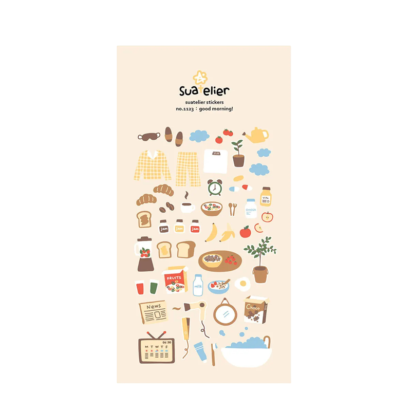Dekorativní arch samolepek je inspirovaný ranní pohodou, snídaní a každodenními začátky dne. Na archu jsou viditelné ilustrace pečiva, cereálií, čaje, ovoce, oblečení, hodin, koupelny a dalších ranních předmětů. Praktický rozměr 9,2x15 cm umožňuje pohodlné uložení do diáře, penálu nebo zásuvky s kreativními potřebami. Samolepky jsou vyrobeny z papíru, který je vhodný pro běžné dekorování a psané projekty. Jemný béžový podklad doplňuje barevné motivy a vytváří čistý a přehledný vzhled archu.