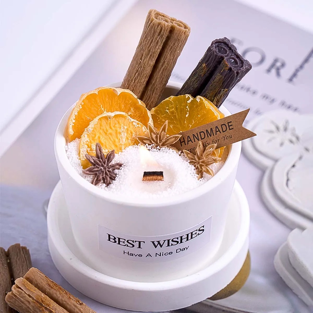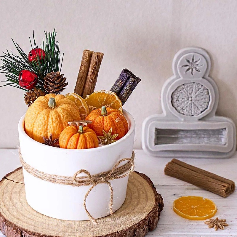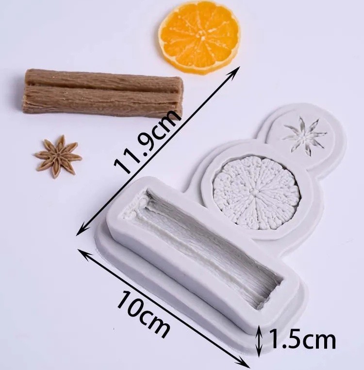 Tato silikonová forma s realistickým motivem vánočního koření – plátku pomeranče, skořicové tyčinky a badyánu je ideální pro odlévání vosku, pryskyřice, sádry, mýdla nebo výrobu dekorativních svíček a ozdob. Díky detailnímu reliéfu vypadají hotové výrobky jako skutečné přírodní ingredience, skvělé pro aromaterapii i vánoční výzdobu.