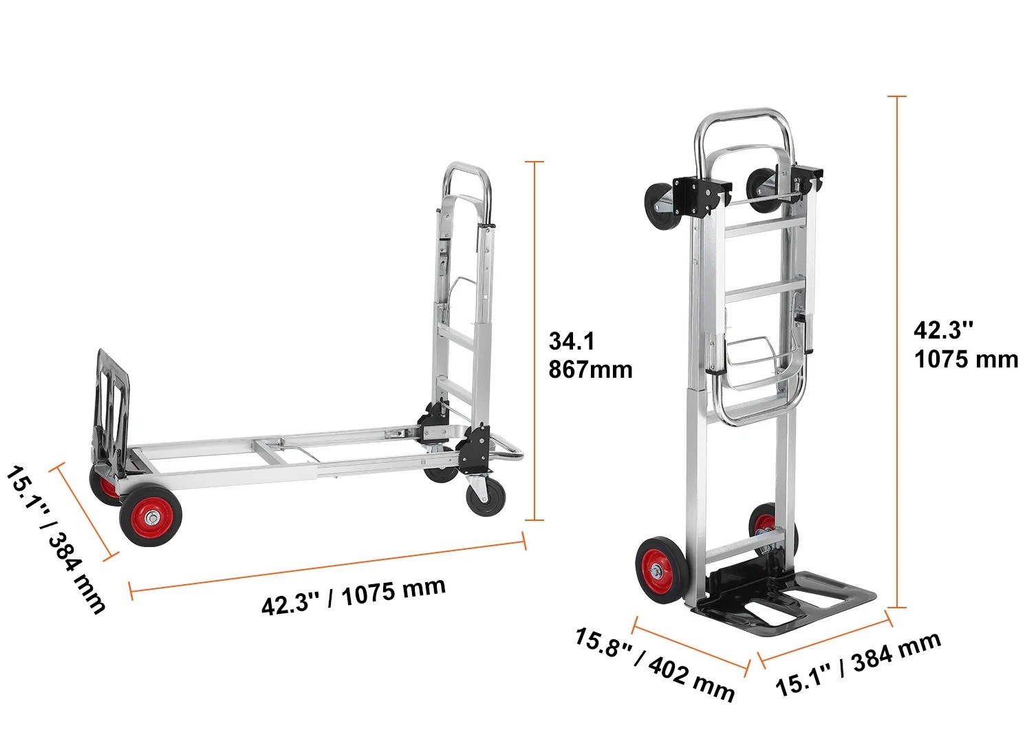 Skládací ruční vozík pro přepravu 181 kg 1075 × 402 × 384 mm hliníková slitina a ocel stříbrný pro stěhování a transport nákladu