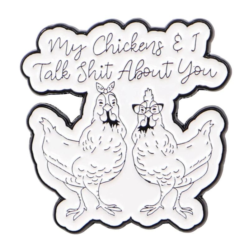 Citát „My Chickens & I Talk Shit About You“ tvoří hlavní prvek designu. Černo bílé barevné provedení zajišťuje kontrast a dobrou viditelnost. Rozměr cca 3,1 × 3,1 cm je praktický pro každodenní použití. Smaltovaný povrch dodává hladký vzhled a zvýrazňuje detaily ilustrace. Kovová konstrukce přispívá k pevnosti a dlouhé životnosti.