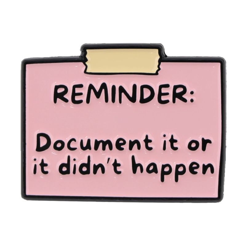 Smaltovaný pin s citátem zaujme jednoduchým a přehledným designem, který připomíná poznámku nebo upozornění. Dominantním prvkem je nápis „Reminder: Document it or it didn’t happen“, který je výrazně zobrazen na růžovém podkladu. Celkové provedení působí čistě a srozumitelně.