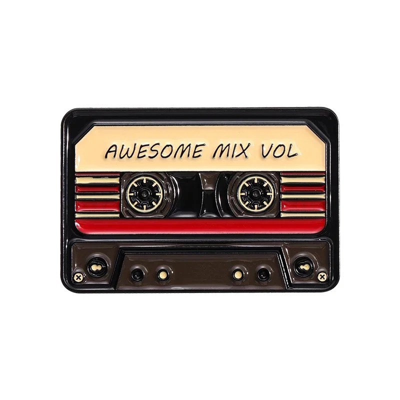 Tato smaltovaná brož má velikost cca 1,8 × 2,8 cm, takže ji lze snadno připnout na klopu, límec, batoh nebo tašku. Tvar kazety je dobře rozpoznatelný a doplněný o detaily, které odpovídají retro stylu. Nápis Awesome Mix Vol tvoří hlavní vizuální prvek a dodává pinu charakteristický vzhled. Pin lze využít jako drobný šperk i jako odznak pro doplnění outfitu.