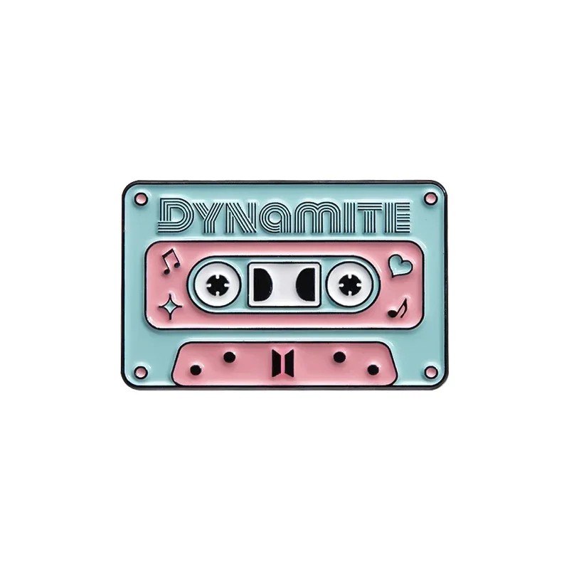 Smaltovaný pin hudební kazeta DYNAMITE cca 2,8 × 1,8 cm kovová brož růžovo-modrá retro odznak na klopu batoh tašku