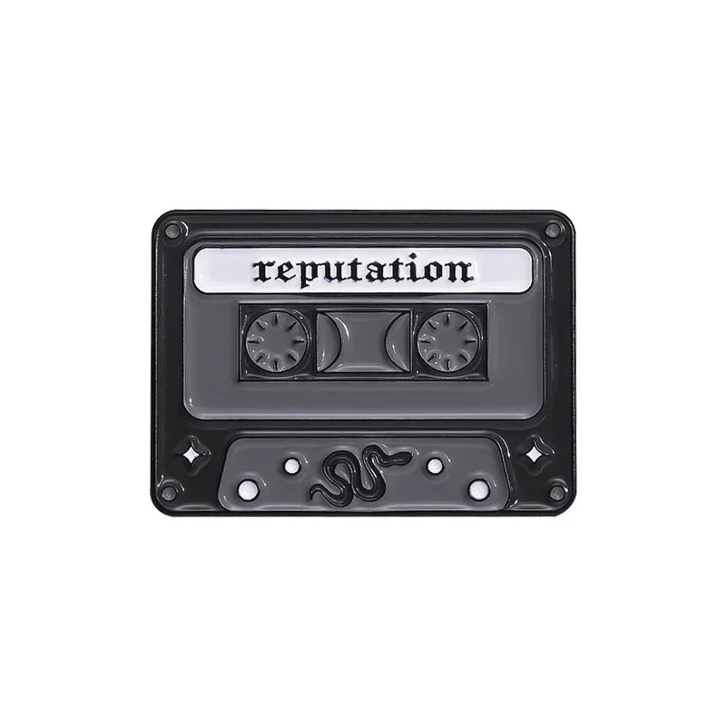 Smaltovaný pin hudební kazeta reputation cca 2,8 × 2 cm kovová brož černo-šedá retro odznak na klopu batoh tašku oblečení