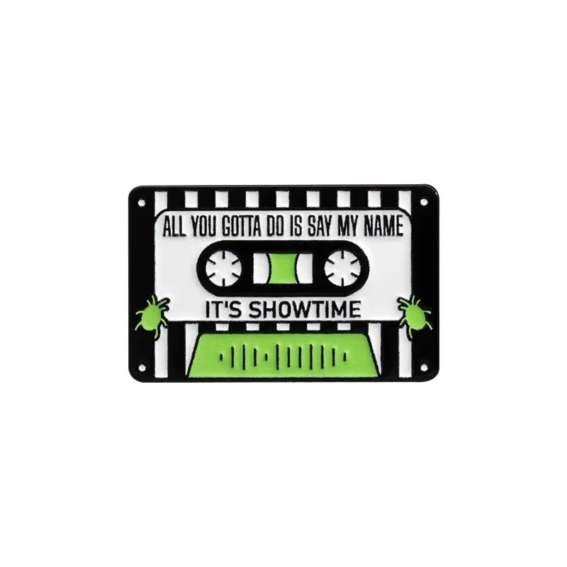 Smaltovaný pin ve tvaru hudební kazety zaujme kontrastním černo-bílým provedením doplněným výraznými zelenými prvky. Na přední straně jsou umístěny nápisy „ALL YOU GOTTA DO IS SAY MY NAME“ a „IT’S SHOWTIME“, které tvoří hlavní vizuální prvek celého designu. Motiv je doplněn detaily kazetových cívek a drobnými grafickými prvky po stranách.