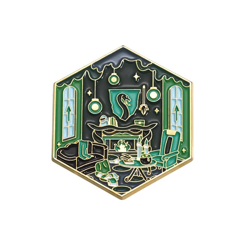 Tento smaltovaný pin s motivem kouzelné místnosti inspirované světem Harryho Pottera zachycuje interiér spojený s kolejí Zmijozel. Motiv obsahuje typické prvky místnosti, jako je krb, nábytek a dekorace, které společně vytvářejí ucelený obraz. Díky svému provedení působí detailně a zároveň přehledně.